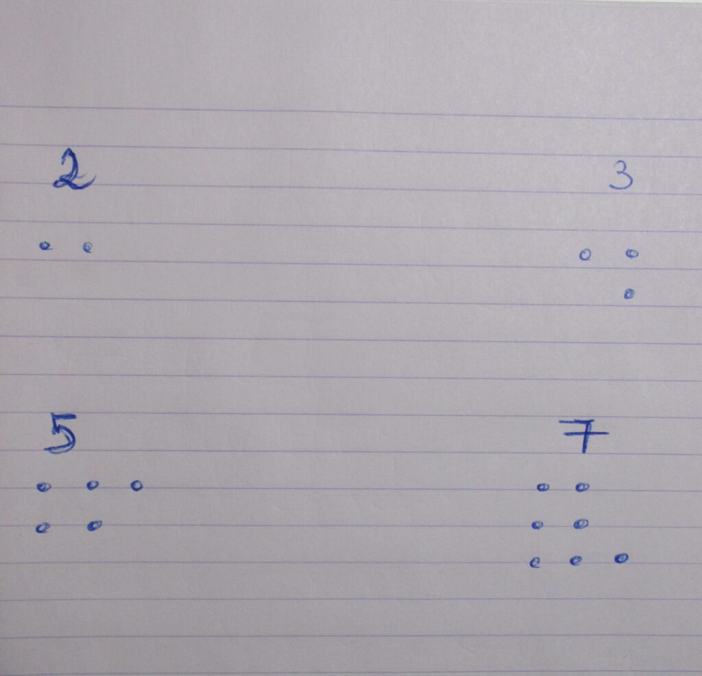 Cuando él dijo que “escuchó la música”, se refería a que las matemáticas muestran verdades eternas —en general son verdades simples, pero eternas al fin y al cabo—. Ejemplificó una de esas verdades eternas diciendo que jamás, nunca, recontra-nunca en la historia de la tierra, de ningún modo pudieron haber 7 dinosaurios dispuestos en una formación de rectángulo (o una bandada de 7 pájaros en formación de rectángulo), pues 7 es un número primo y los rectángulos no pueden formarse con una cantidad prima de elementos1. Si no me creen, pueden hacer la prueba tratando de formar un rectángulo con una cantidad prima de puntos (2, 3, 5, 7, …).